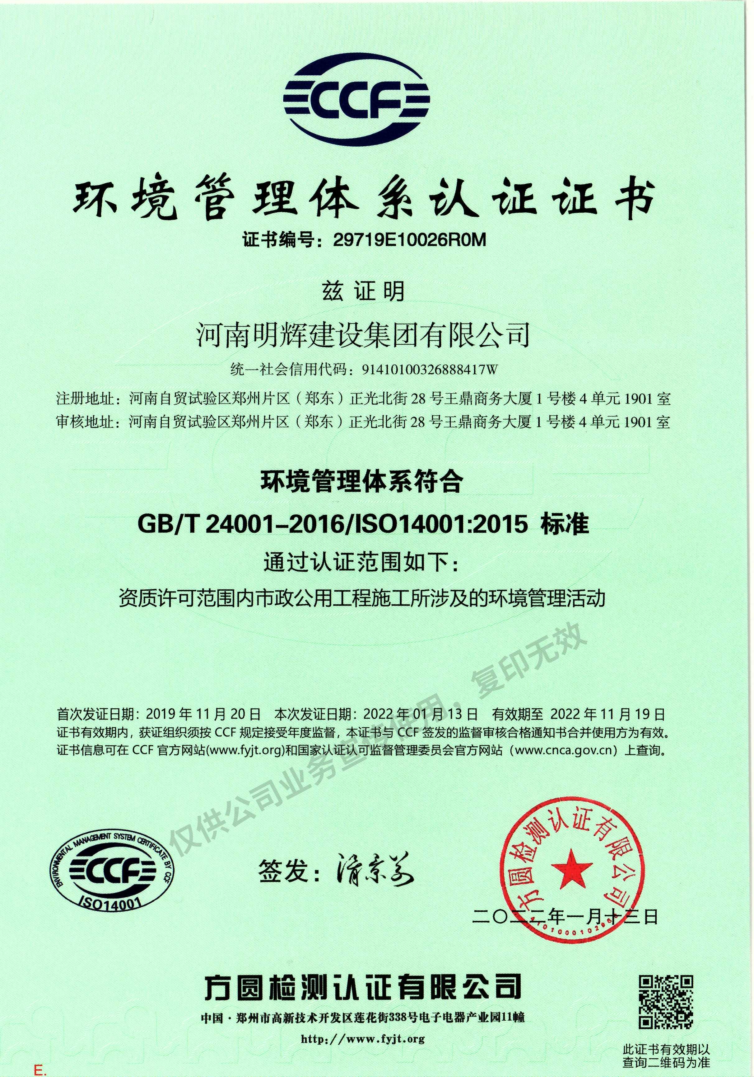 环境管理体系认证证书
